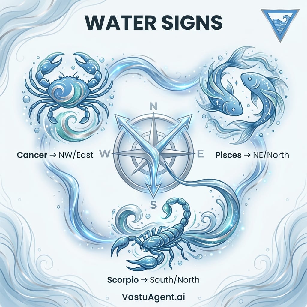 Water signs need emotional security, intuitive space, and nurturing environments. Your optimal house facing creates sanctuary-like energy.