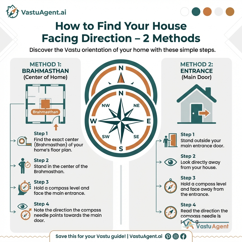 You can verify your home's exact facing direction in seconds using VastuAgent.ai's free Vastu Compass tool—it helps you accurately determine both your architectural and entrance orientations.